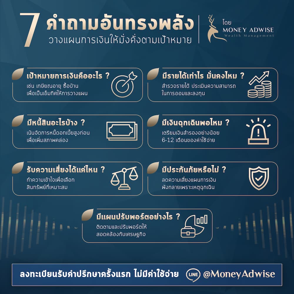 ที่สำคัญ การเริ่มต้นสร้าง Roadmap ด้านการเงินไม่ได้ยากอย่างที่หลาย ๆ คนคิด เพียงแค่เริ่มจากการตอบคำถามอันทรงพลังทั้ง 7 ข้อ ที่จะเปลี่ยนวิธีคิดเรื่องเงิน และกำหนดทิศทางทางการเงินของคุณไปตลอดชีวิต