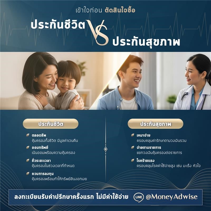 Money Adwise คือผู้เชี่ยวชาญด้านการวางแผนทางการเงิน วางแผนประกันชีวิต และประกันสุขภาพแบบครบวงจร ซึ่งนักวางแผนการเงินคุณวุฒิ CFP® ของเราพร้อมช่วยคุณเลือกแผนประกันชีวิต และประกันสุขภาพที่เหมาะสมกับความต้องการ เพื่อให้คุณได้รับการคุ้มครองที่ครอบคลุม และใช้สิทธิประโยชน์ทางภาษีได้อย่างคุ้มค่า พร้อมกับช่วยให้คุณมั่นใจว่า ทั้งตัวคุณและครอบครัวจะได้รับการคุ้มครองที่ดีที่สุด ลงทะเบียนนัดรับคำปรึกษาครั้งแรกไม่มีค่าใช้จ่าย หรือปรึกษาด่วนผ่านทาง LINE Official @MoneyAdwise